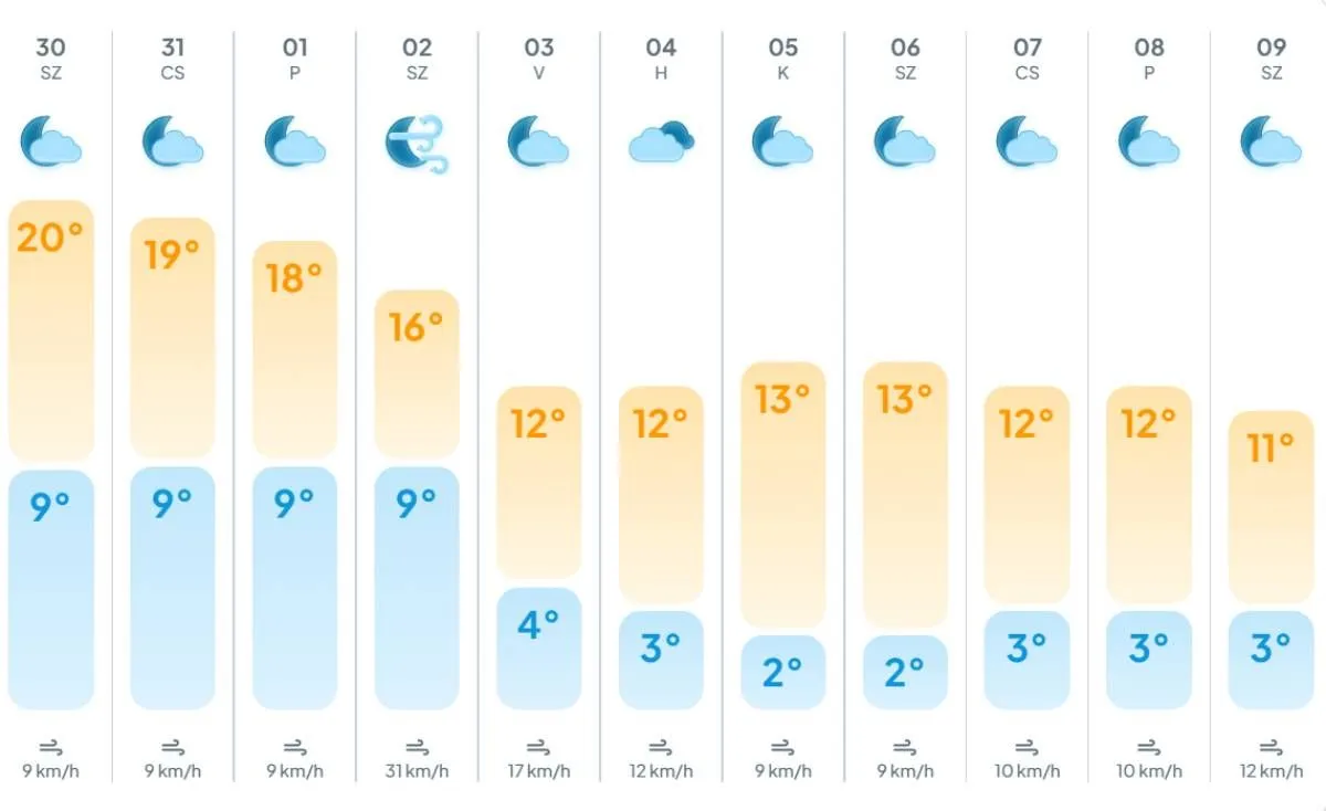A Köpönyeg oldalának hosszabb távú előrejelzését alapul véve kijelenthetjük: vasárnaptól, november 3-tól érezhetően hűvösebb lesz. Míg addig a 18-20 fokos nappali hőmérsékletek lesznek a mérvadók, a hét utolsó napjától ez jellemzően 12-13 fokra csökken, és az éjszakák is kifejezetten hűvösebbé válnak.