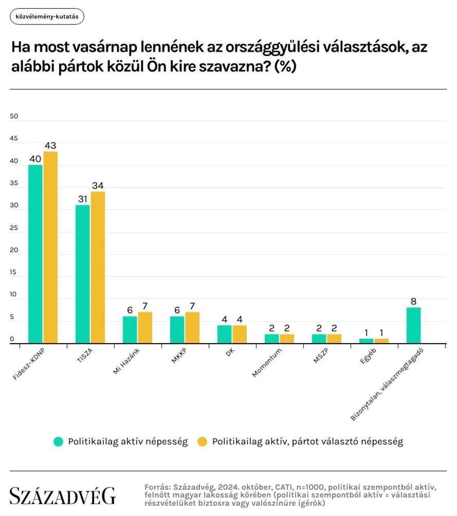 A politikai szempontból aktív (választási részvételüket biztosra vagy valószínűre ígérő) magyar lakosság körében jelenleg 40 százalékon állnak a kormánypártok. Második helyen – kilenc százalékospontos hátrányban – 31 százalékkal a Tisztelet és Szabadság Párt (TISZA) áll, harmadik helyen pedig a Mi Hazánk Mozgalom és a Magyar Kétfarkú Kutyapárt (MKKP), egyaránt 6-6 százalékkal. A baloldali pártok jelenleg az 5 százalékos bejutási küszöb alatt tartózkodnak.
