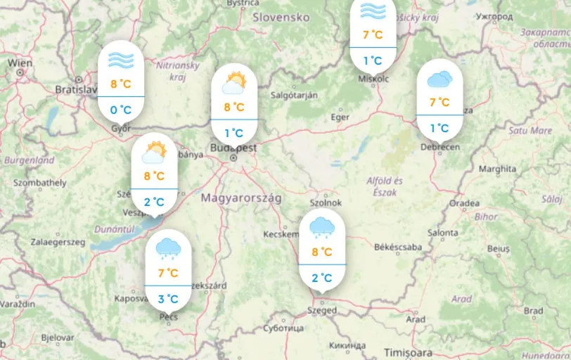 Az elmúlt napok borús időjárása után a hétvége első napján, szombaton végre többórás napsütésre van kilátás, azonban délután délen újra befelhősödhet az ég, ott néhol záporeső várható. Az északias szél több helyen élénk lesz. A hajnal fagyosan indul, néhol 0 fok alá esik a hőmérséklet. A délutáni csúcshőmérséklet 5-10 fok között várható.