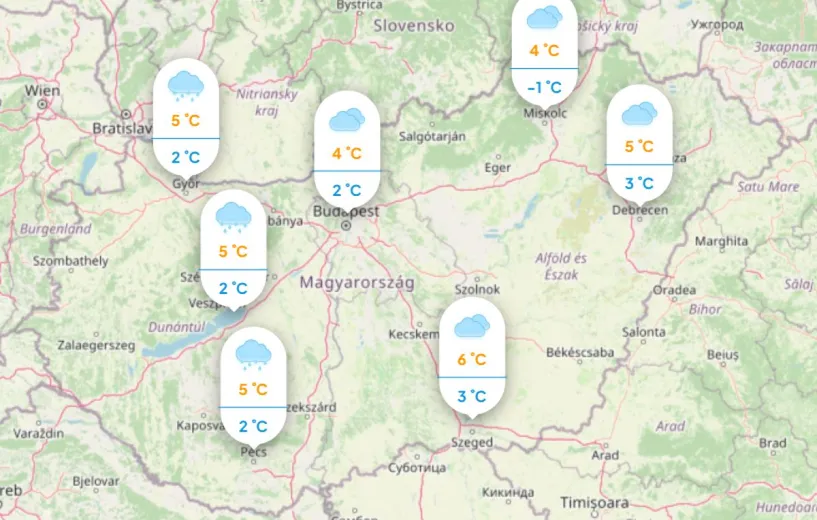 A hét közepén is marad a nagyrész borús, erősen felhős időjárás. Napsütésre egyedül északnyugaton lehet számítani. A felhőkből napközben, főként a kora délelőtti órákban szitálás, vegyes halmazállapotú csapadék is várható. Az északiasra forduló szél helyenként megélénkül, de főként mérsékelt maradt. A legmagasabb nappali hőmérséklet 1-7 fok között várható.