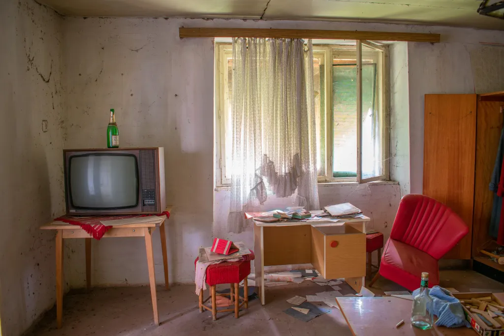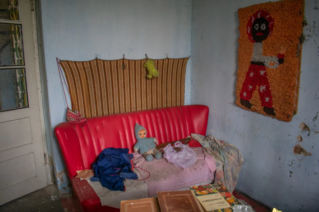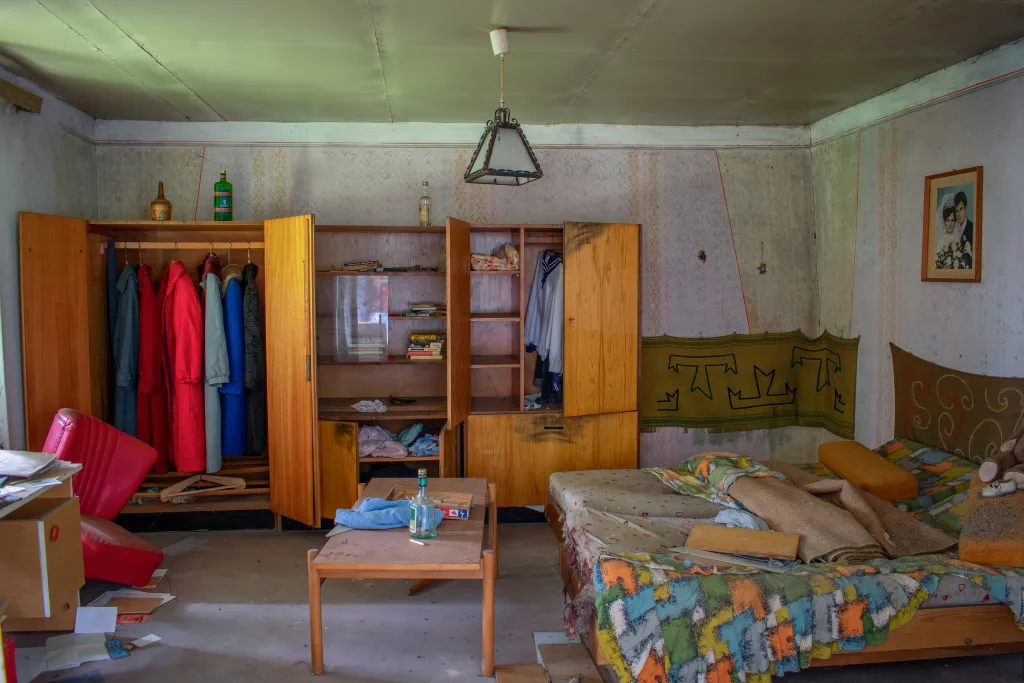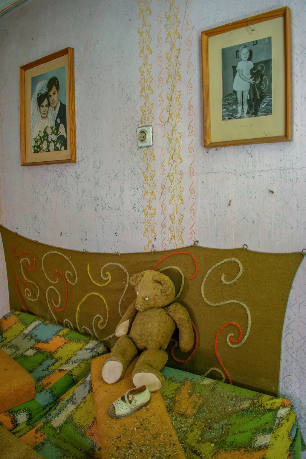 Mindent hátrahagytak: italos üvegek a szekrény tetején, kabátok, ballagási ing a ruhásszekrényben, gyerekholmik szanaszét. Egy rácsos ágy a sarokban porosodik, plüssmaci és játékbaba ül a fotelben; de még a tévét sem vitték el.