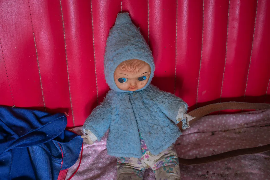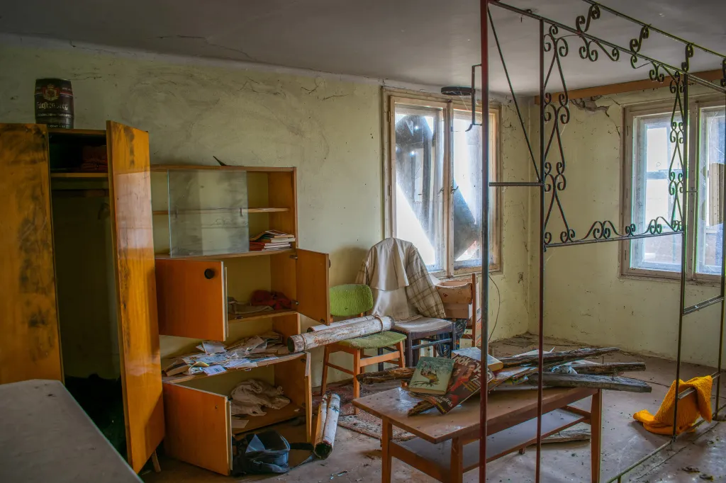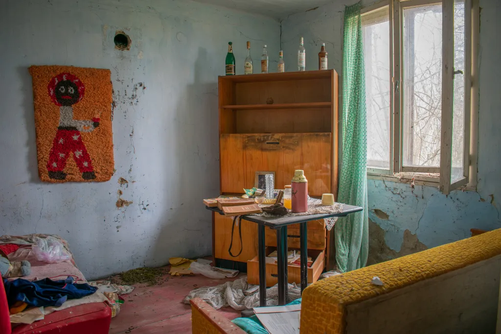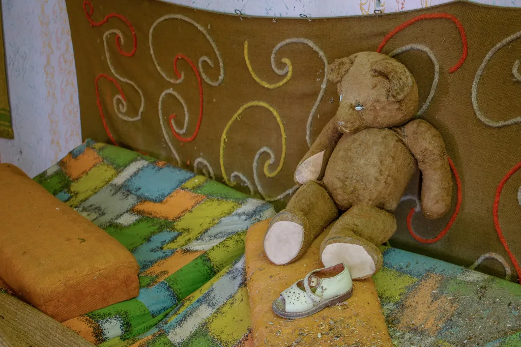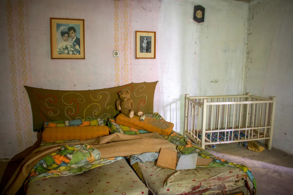 Mindent hátrahagytak: italos üvegek a szekrény tetején, kabátok, ballagási ing a ruhásszekrényben, gyerekholmik szanaszét. Egy rácsos ágy a sarokban porosodik, plüssmaci és játékbaba ül a fotelben; de még a tévét sem vitték el.