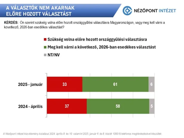 Nem ért egyet Magyar Péter újévi beszédében megfogalmazott követelésével a választók jelentős többsége, az előre hozott országgyűlési választások kiírásával – derül ki a Nézőpont Intézet január második hetében lefolytatott közvélemény-kutatásából. Mint írták,