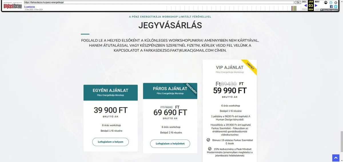 Érdekesség, hogy akik a workshop segítségével szerettek volna megbarátkozni a pénzzel, azoknak bizony jócskán a zsebükbe kellett nyúlniuk, a hatórás foglalkozás ugyanis a weoldal archivált verziójának adatai szerint (lenti képernyőkép) közel 40 ezer forintba került fejenként, akik pedig még jobban szerették volna magukhoz vonzani a pénzt, ők „akciósan” hozzájuthattak a VIP-csomaghoz, amely közel 60 ezer forintba került.