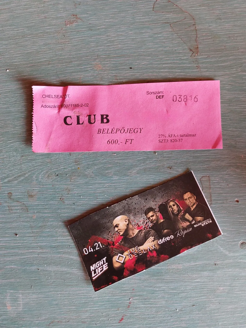 A puszta közepén álló diszkó recepcióján rengeteg papír hever szanaszét; egy régi jegyen látszik, hogy 600 forint volt a belépő, sört már 240 forintért is lehetett inni, egy pohár kávéért 150 forintot kértek, de sonkás szendvicset is kaphattunk 240 forintért.