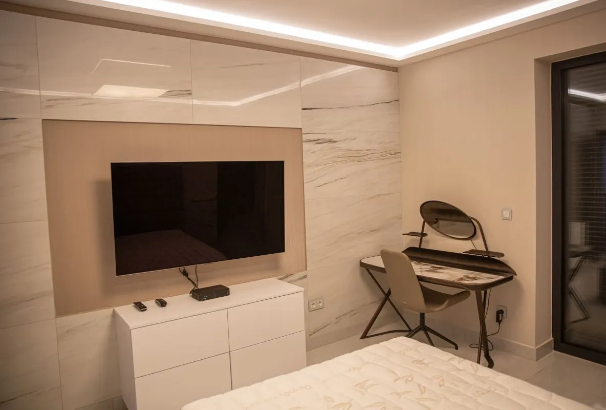 Épült mozi szoba, beépített, térhangzást biztosító hifivel, 2 méter átmérőjű televízióval és elektromos üvegkandallóval.