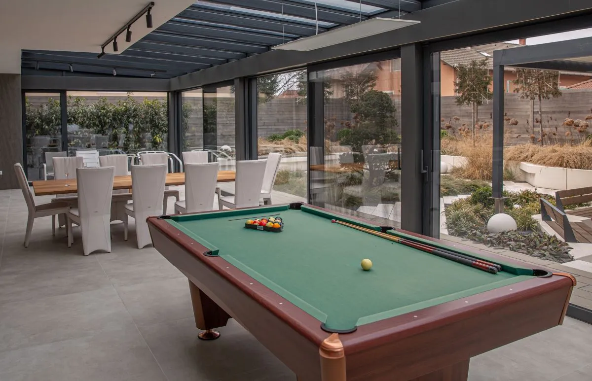 A billiárdterem a földszinten található, ezt három oldalról teljes üvegpanorámával kellett megépíteni. Az igények között szerepelt, hogy hivatalos méretű, versenyzésre is alkalmas „profi” billiárdasztalt kell beszerezni 3 millióért.