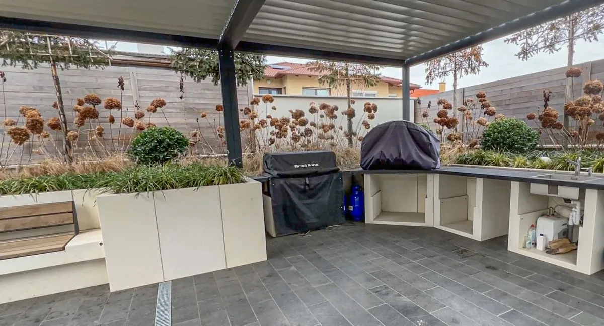De grillteraszból egy nem volt elég, lett belőle még egy a földszinten is, ugyanazokkal a méregdrága, korszerű sütő-főző berendezésekkel.