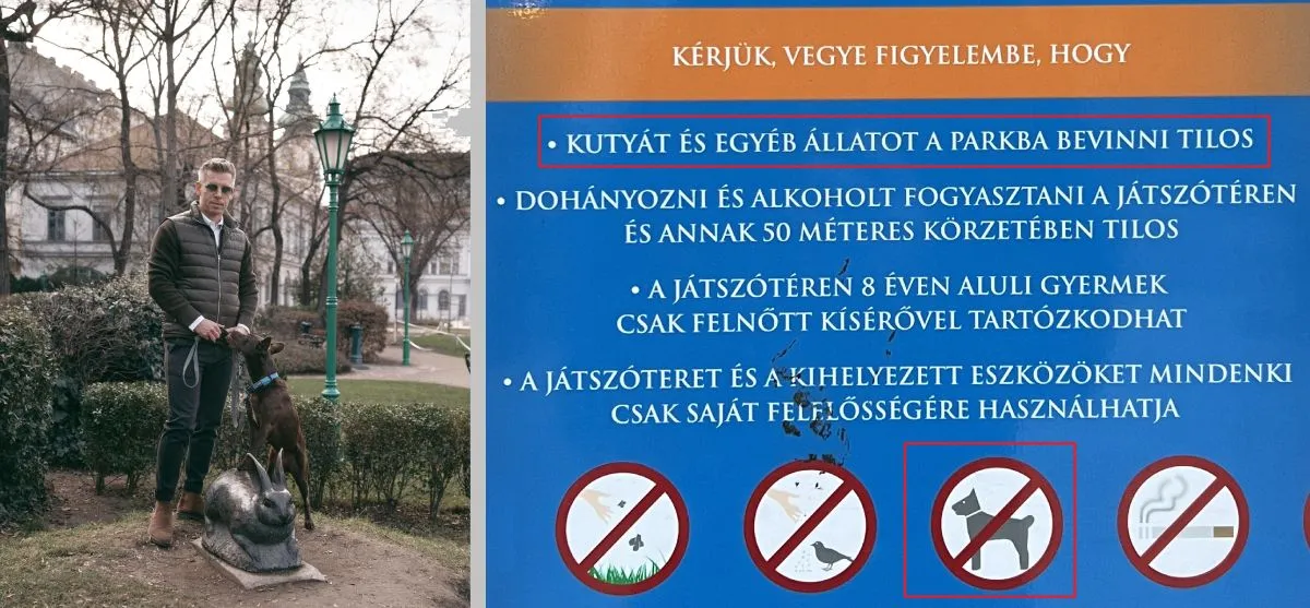Tizenhat darab, jól láthatóan kihelyezett "kutyát bevinni tilos" táblát hagyott figyelmen kívül Magyar Péter, amikor a Budapest belvárosában található, játszótérként működő Károlyi Kertbe vitte sétálni "Brumi" kutyát, hogy az állat könnyíthessen magán. Ezzel maga a Tisza-elnök büszkélkedett el a Facebook-oldalán, egy nemrég közzétett fotóval...