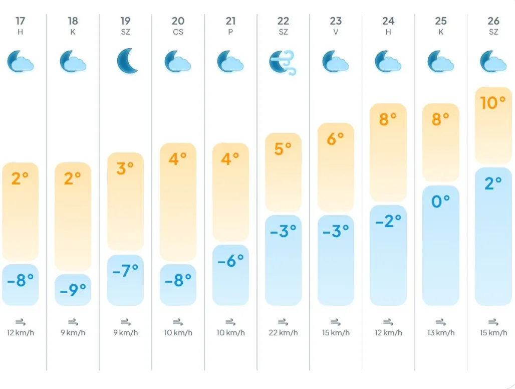 A Köpönyeg hosszabb távú előrejelzése azt mutatja, hogy nagyjából péntekig, február 21-ig kell még komolyabban dideregnünk, utána lassan, de biztosan indul meg a felmelegedés. Február 26-ra már plusz tíz fok is lehet nappal, és éjszaka sem megy fagypont alá a hőmérséklet.