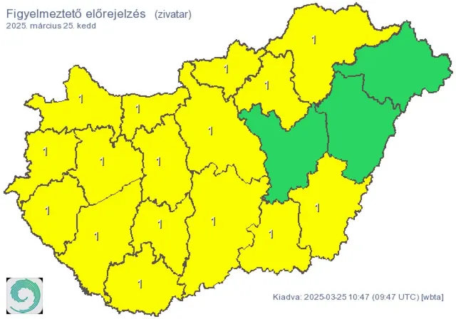 Elsőfokú, citromsárga riasztást adott ki zivatarok kialakulása miatt a HungaroMet. Az érintett területeken az elsődleges veszélyforrást a villámlás jelenti, emellett esetenként megerősödhet a szél, és jégeső is előfordulhat.