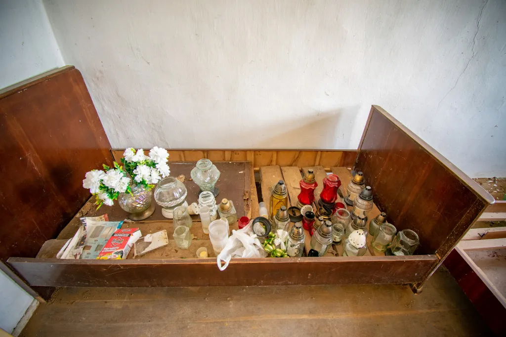 Azt nem lehet tudni, hogy pontosan mikor és miért tűnhettek el a lakók, de valószínűleg sietősen kellett távozniuk. A kanapén hever a levetett nadrág és zokni, a padlón pedig a gumicsizma. Az ágykeret tele van mécsesekkel...