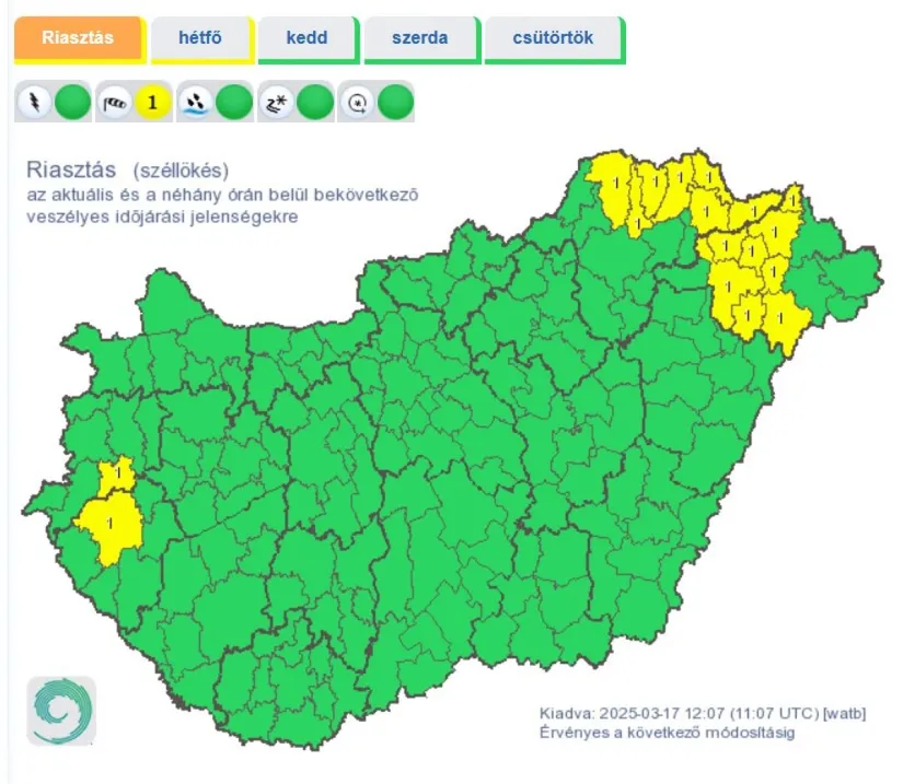 Elsőfokú, citromsárga riasztást adott ki az erős szél veszélye miatt a HungaroMet. Az érintett területeken a széllökések sebessége meghaladhatja a 70 kilométer/órát is. Amennyiben a HungaroMet visszavonja az ország területéről az elsőfokú riasztást, vagy másodfokú riasztást ad ki, arról újabb közleményben számol be a katasztrófavédelem. A riasztások által érintett területeket, járásokat az alábbi hivatkozáson elérhető, folyamatosan frissülő térképen követhetik nyomon.