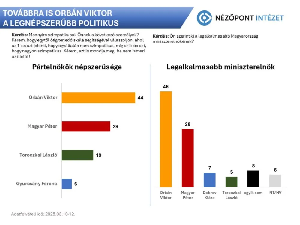 A magyarok szerint továbbra is Orbán Viktor a legalkalmasabb Magyarország miniszterelnöki posztjának betöltésére (46 százalék). Itt még nagyobb a lemaradása Magyar Péternek, hiszen őt mindössze a választók 28 százaléka tartja a legalkalmasabbnak az ország vezetésére. Ugyanebben a kategóriában Dobrev Klára, a Demokratikus Koalíció egykori árnyékkormányának miniszterelnök-jelöltje mögött a magyarok 7 százaléka, míg Toroczkai László mögött mindössze 5 százaléka áll.