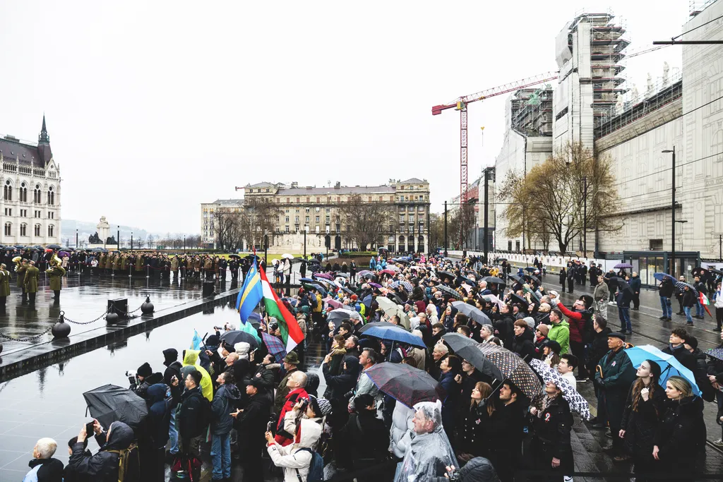 A térre a borult, csapadékos időjárás ellenére több százan kilátogattak, az érdeklődők nemzeti színű kokárdát viseltek.