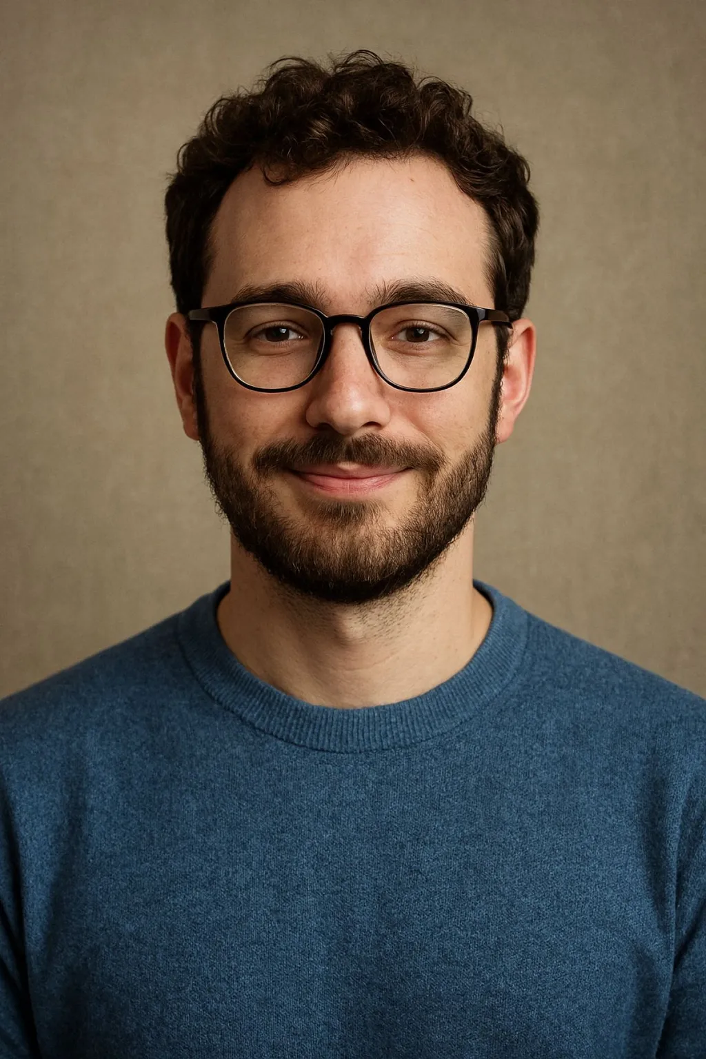 „Egy huszonévei végén vagy harmincas évei elején járó fiatal férfi világos olajbarna bőrszínnel, barátságos mosollyal és kócos, göndör barna hajjal. Kék, kereknyakú pulóvert visel és fekete szemüveget. Egy puha, bézs háttér előtt néz közvetlenül a kamerába, természetes, egyenletes megvilágítás mellett, amely kiemeli az arcvonásait és finom kontrasztokat hoz létre a meleg színpalettában.”