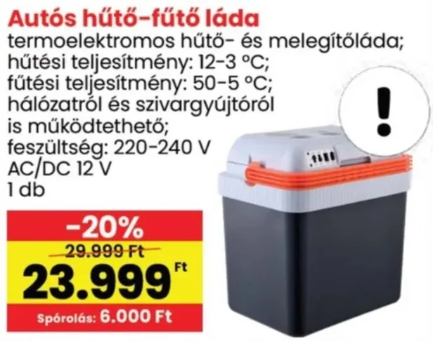 Az autós hűtő-fűtő láda mindig jól jön, főleg hosszabb utakon, hiszen ennek köszönhetően nem olvad meg például az útra elvitt csoki, vagy nem romlik meg az úton az étel, ráadásul minden autóba belefér, nem foglal sok helyet. Elektromos, így hálózatról vagy szivargyújtóról is működőképes – az ára most mindössze 23.999 Ft, az akció csak a készlet erejéig érvényes.