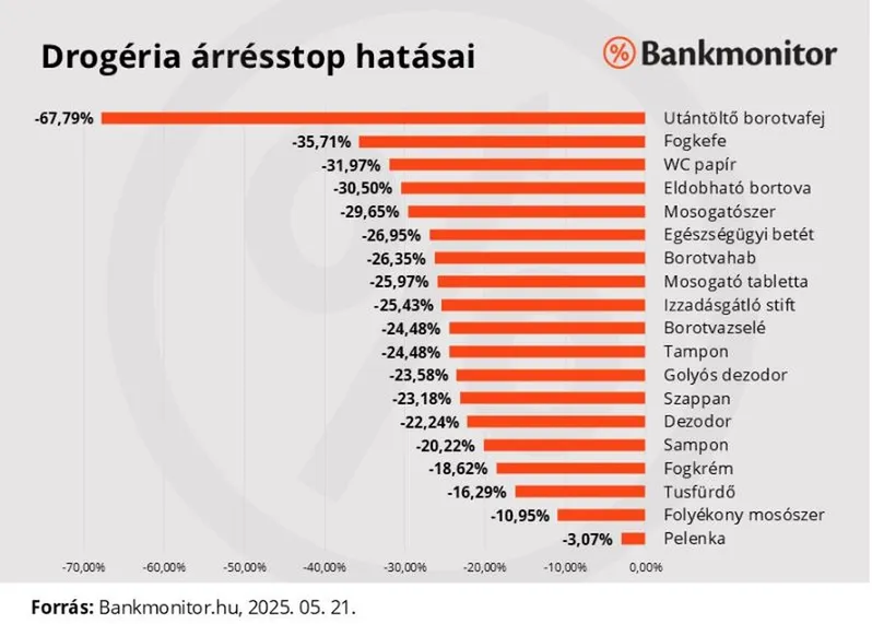 Az árrésstop hatására például az utántöltő borotvafej ára csökkent a legnagyobb mértékben 67,79%-kal, a toalettpapír ára 35,71%-kal, a szappanok 23,18%-kal kerülnek kevesebbe, míg a pelenka csupán 3,07%-kal lett olcsóbb. Ezek az adatok a Bankmonitor szerint alátámasztják, hogy a bevezetett intézkedés érdemben hat a fogyasztói árakra.