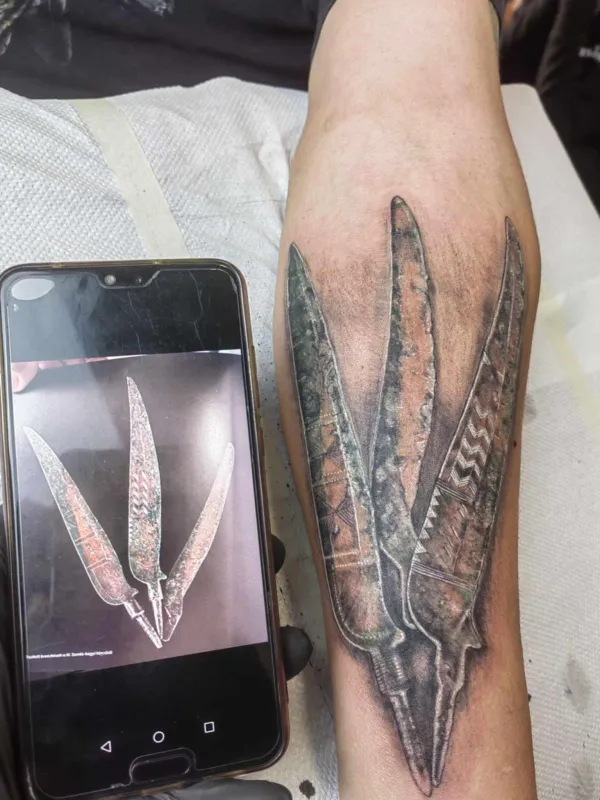 Péter a három gazdagon díszített kést az alkarjára tetováltatta, ezzel is tisztelegve a talált leletegyüttes előtt és áldozva a hegy szellemének. Kérdésünkre elmondta: ahhoz, hogy találjanak valami érdekeset, szerencse is kell, meg kitartás és jó terület. Ő abban is szerencsés, hogy a feleségének is ez a hobbija, így együtt járnak keresni. Ez önkéntes munka, pénzt nem kapnak érte, az élmény és a siker azonban az övék. Érdekli őket a történelem, folyamatosan tanulnak, a keresés közben pedig szép tájakat ismernek meg.
