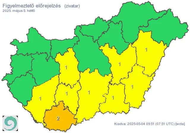 A hét első napján az előző, nyárias napokhoz képest zord arcát mutatja majd az időjárás. Hétfőn ugyanis egy hidegfront hatására mindenhol erősen felhős, borult lesz az ég, többfelé alakul majd ki eső, zápor és zivatar is. A HungaroMet Baranya vármegyére másodfokú, narancssárga riasztást is kiadott a zivatar veszélye miatt. Emellett néhol viharos szélre is számtani kell, a hőmérséklet 15-17 fokra esik vissza.