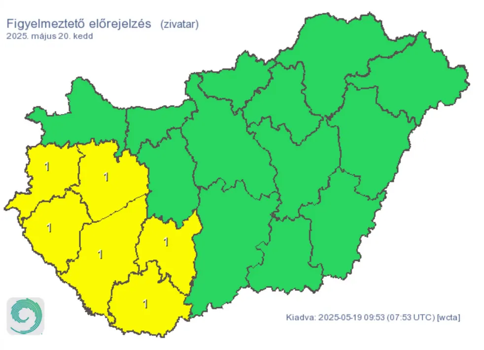 A HungaroMet Nonprofit Zrt. citromsárga figyelmeztetést adott ki a keddi napra 6 vármegyére a várható zivatar miatt. Elsődleges veszélyforrást a villámlás jelenti, emellett esetenként szélerősödés, jégeső előfordulhat. Mutatjuk az érintett területeket: