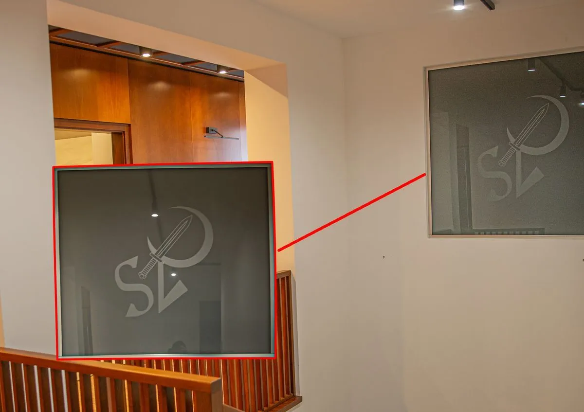 Szintén sajátos a lépcsőházat díszítő üvegcímer, speciális családi logóval, amibe Ruszin-Szendi és felesége kezdőbetűit, valamint a tábornok kedvenc katonai tőrét is belefoglalták.