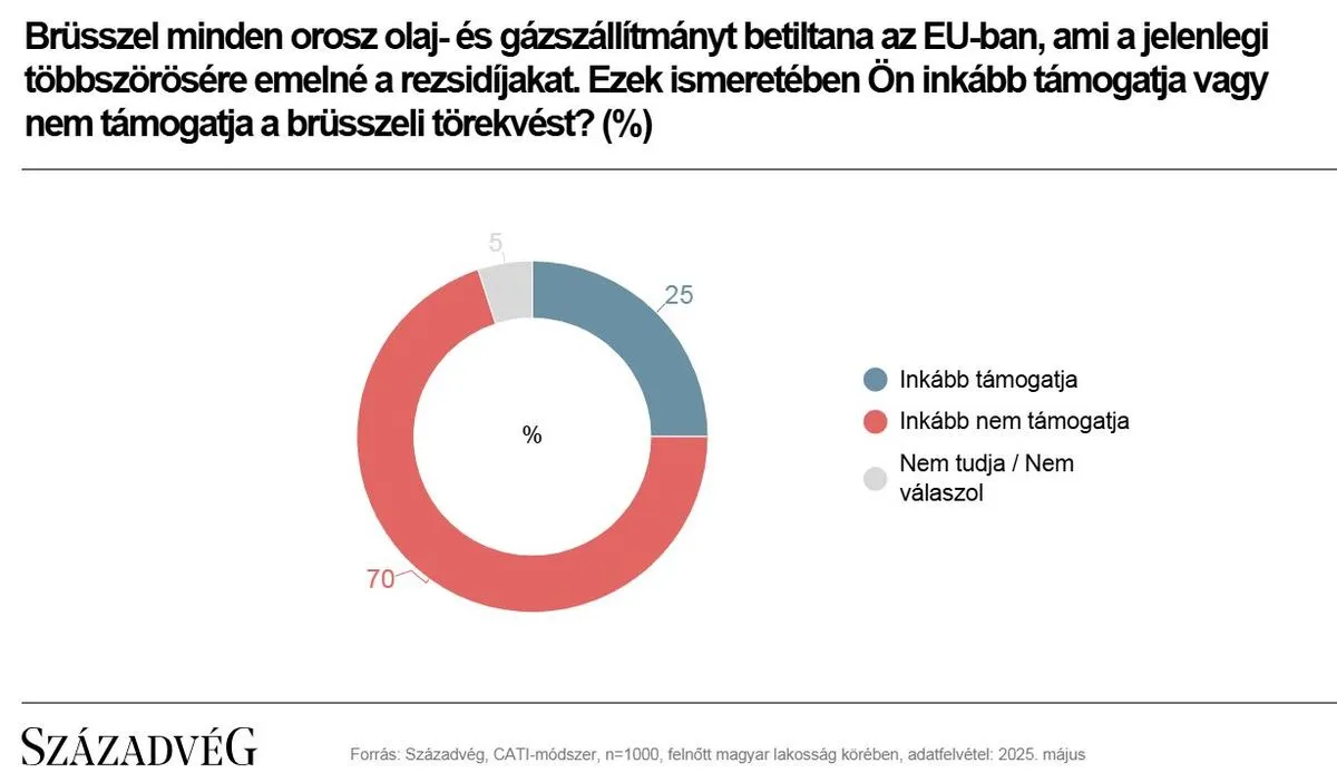 Ezzel kapcsolatban a Századvég megkérdezte a magyarok véleményét. A Századvég új kutatásának eredményei alapján tíz válaszadóból hét elutasítja, és mindössze negyedük támogatja a brüsszeli törekvést. Kijelenthető tehát, hogy az orosz olaj- és gázszállítások tiltásának nincs társadalmi legitimitása.