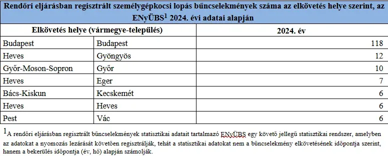 Az ORFK adatbázisa szerint tavaly a legtöbb autót a fővárosból lopták el: 118 lopott bejelentés érkezett a rendőrséghez olyan autókról, amik Budapestről tűntek el. A második legtöbb autót ugyanakkor már nem a főváros környékéről, hanem onnan jóval messzebbről, Gyöngyösön lopták el az autótolvajok. Az alábbi táblázat azt ábrázolja, hogy melyik települések állnak a lista élén: