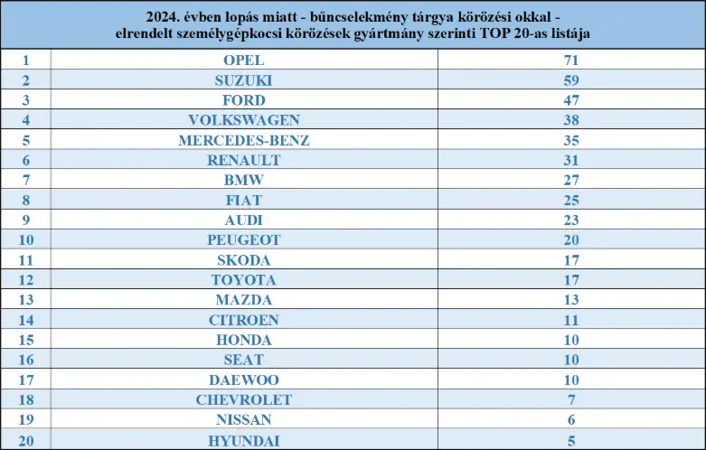 A rendőrségi arról is adatbázist vezet, hogy melyik típusú autókból pontosan hány darabot lopnak el. A tavalyi év során a legtöbb lopott autó Opel volt, a második helyen a Suzuki áll, a harmadikon pedig Ford.