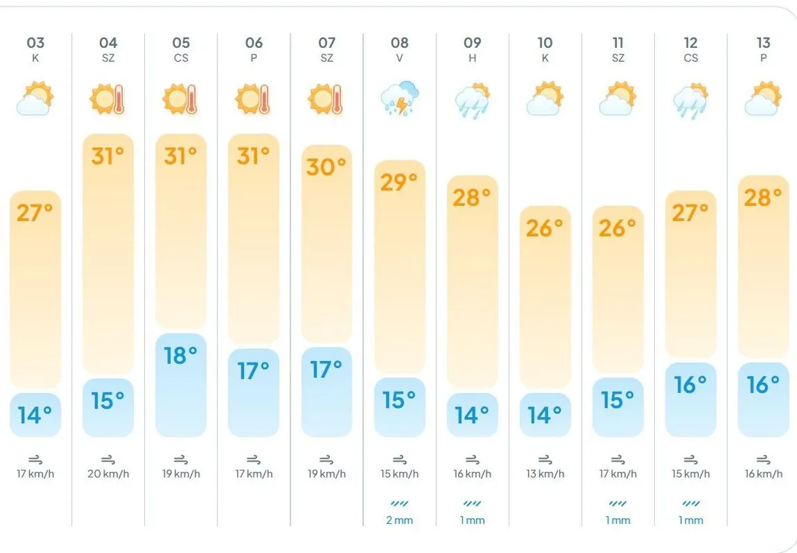 Szerdán, június 4-én azonban már visszatér a nyári idő: ragyogó napsütésre számíthatunk, szinte teljesen felhőmentes éggel, csak enyhe, időnkénti szélmozgással. Ez a napos, meleg idő péntekig fennmarad, és a csúcshőmérséklet akár a 35 fokot is elérheti.