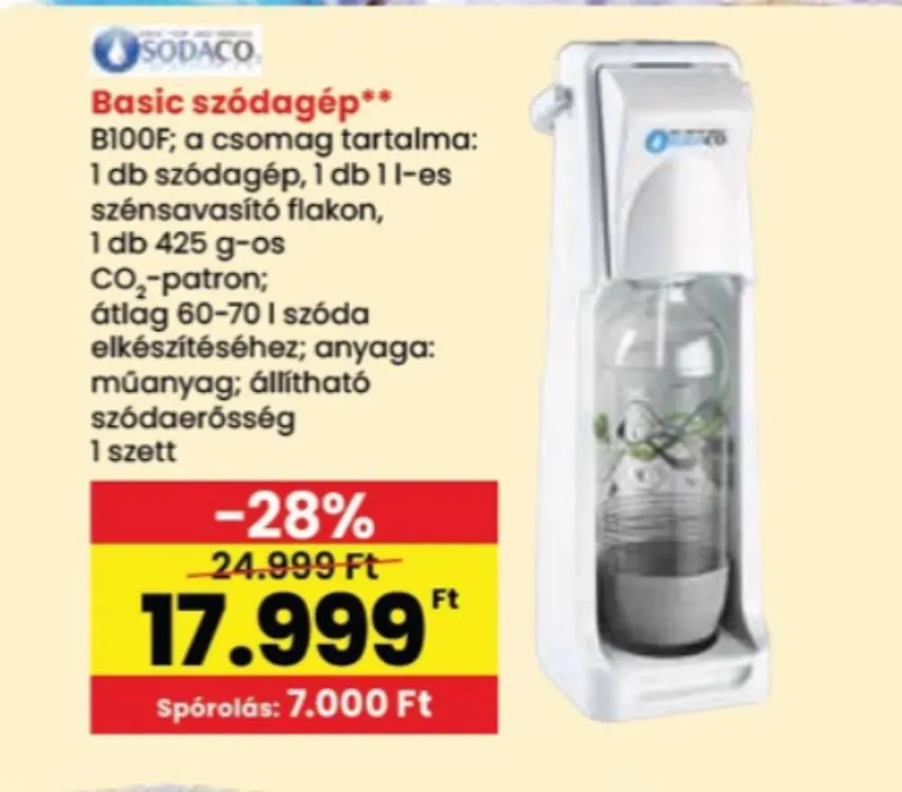 A Sodaco Basic szódagép ugyanis 28%-os kedvezménnyel, mindössze 17.999 Ft-ért kapható (az eredeti ár 24.999 Ft volt), így 7.000 forintot spórolhat az, aki most vásárol. A szett tartalmaz mindent, amire az induláshoz szükség van: egy szódagépet, egy 1 literes szénsavasító palackot és egy 425 g-os CO₂ patront, ami átlagosan 60–70 liter szóda elkészítésére elegendő. A készülék műanyag házzal és állítható szénsav-erősséggel rendelkezik - hívta fel rá a figyelmet a Mindmegette.