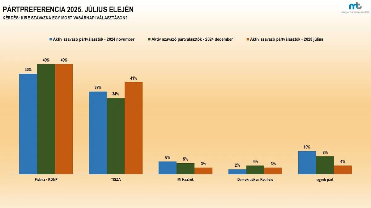 A Magyar Társadalomkutató 6 hónappal legutóbbi pártpreferencia jelentése után, 2025 július elején is felmérést készített arról, hogy egy esetleges azonnali választáson miképp szerepelnének a magyarországi pártok.