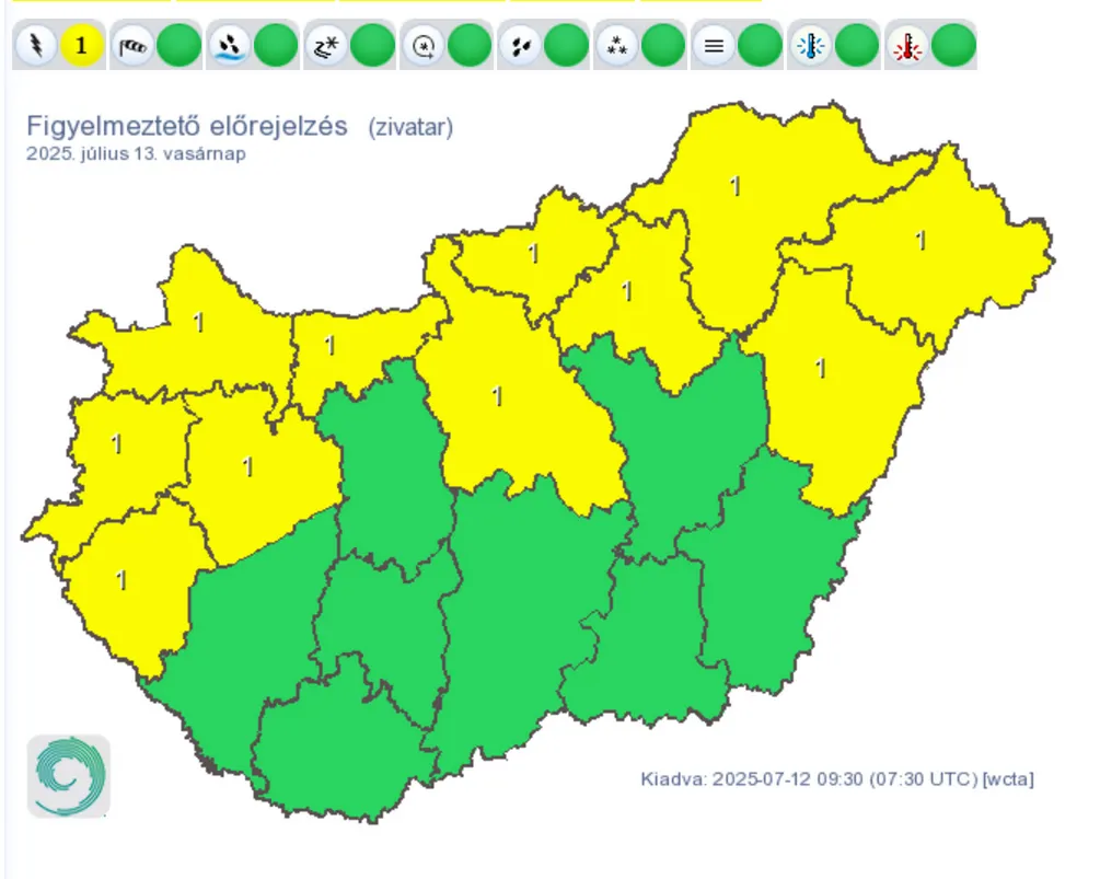 Az időjárás előrejelzés szerint vasárnap derűs időszakokra is számíthatunk gomolyfelhőkkel tarkítva. Délnyugat felől elszórtan záporok, zivatarok jöhetnek. Visszatér a nyári hőség: a maximumok megközelítik a 30 fokot. Ennek ellenére a HungaroMet Nonprofit Zrt. veszélyjelzésében továbbra is citromsárga riasztást adtak ki több vármegyére a zivatarok miatt: ezeken a területeken az elsődleges veszélyforrást a villámlás jelenti, emellett esetenként szélerősödés, jégeső is előfordulhat.