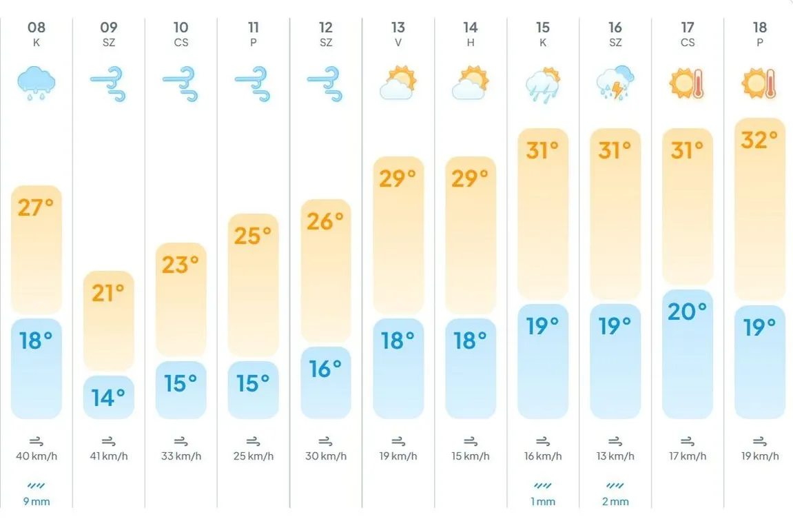 Szerdán a nedves levegő mellett marad az erős szél, a hőmérséklet 18–25 fok közé esik, de az is esélyes, hogy néhol a nap is megmutatja magát.