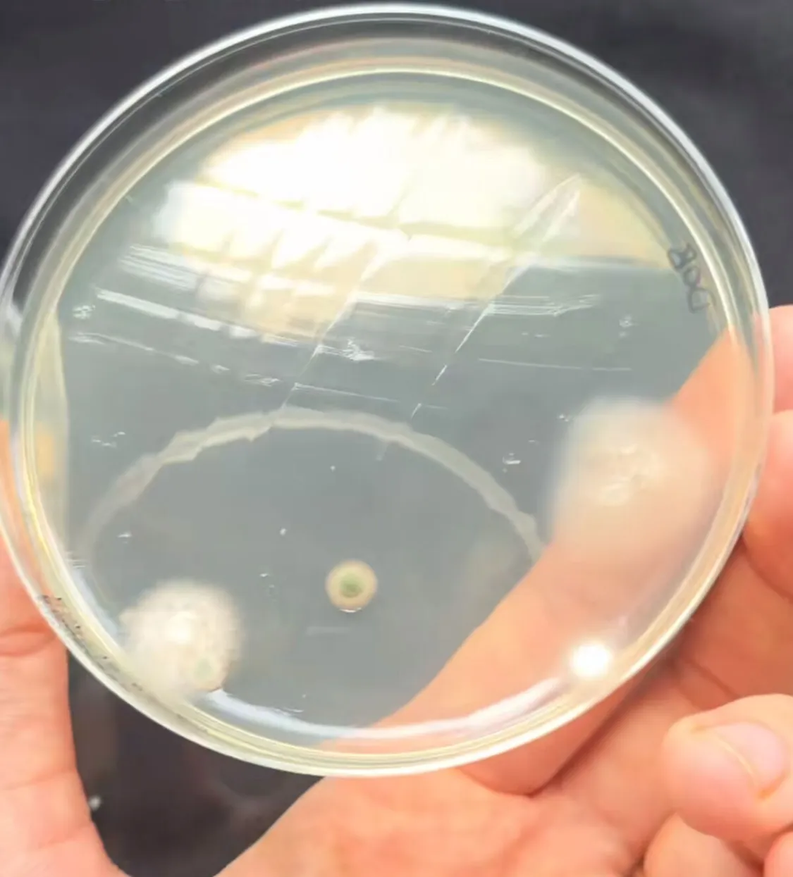 Az első agar lemezre a dob mintáit helyeztem rá, amin összesen három-négy gombatelep jelent meg. A gumis részből vett minta sokkal durvább. Szemmel láthatóan több gombatelep nőtt fel. Szemmel nem látható, hogy egy-egy gombatelep alatt van baktériumkolónia is; mivel együtt növekedtek, ránőtt a gombatelep