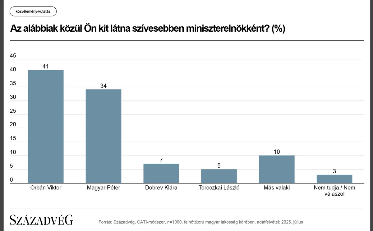 Többen látnák szívesebben Orbán Viktort (41 százalék) a kormányfői pozícióban a következő négy évben is, mint Magyar Pétert (34 százalék) – ez derül ki a Századvég júliusi közvélemény-kutatásából. A felmérés a közelgő – 2026 tavaszán esedékes – országgyűlési választásokra tekintettel feltérképezte, hogy a mandátumszerzésre esélyes pártok vezetői közül a felnőtt magyar lakosság kire bízná szívesebben Magyarország vezetését.