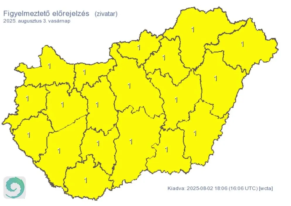 Az Országos Meteorológiai Szolgálat a teljes országra elsőfokú riasztást adott ki zivatar miatt. Mint írják, megerősödött széllökésekre és jégesőre is számíthatunk.