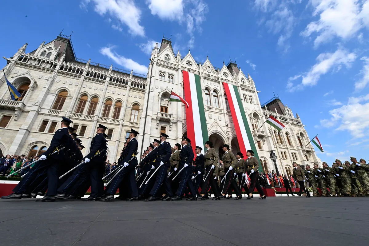 Katonai tiszteletadás mellett, Sulyok Tamás köztársasági elnök jelenlétében felvonták Magyarország nemzeti lobogóját az augusztus 20-i állami ünnepen, szerda reggel a Parlament előtti Kossuth Lajos téren.