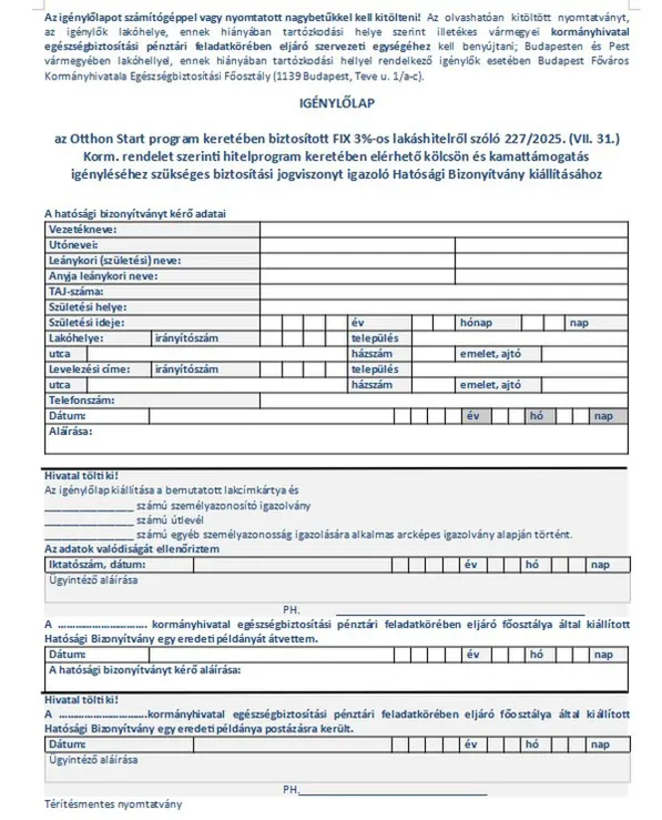 A hitel igényléséhez emellett biztosan szükség lesz egy 30 napnál nem régebbi TB jogviszony igazolásra. Ezt a tartózkodási helyünk szerinti kormányhivatalnál lehet kikérni személyesen, e-papíron vagy postai úton egy igénylőlap kitöltését követően. Ez utóbbit már le is lehet tölteni!