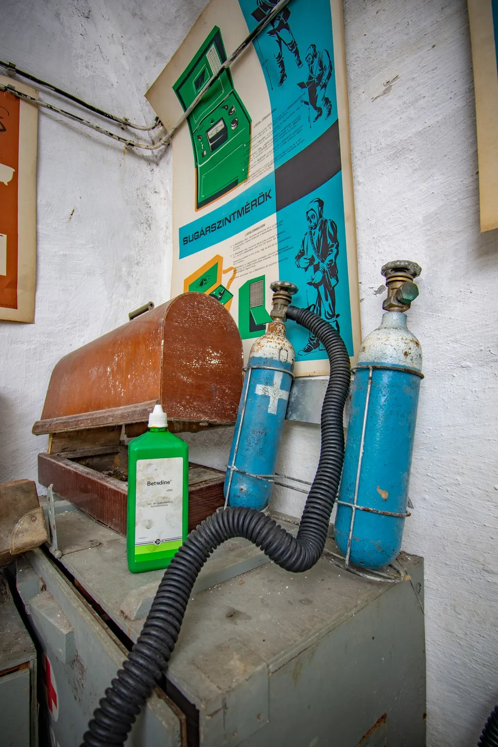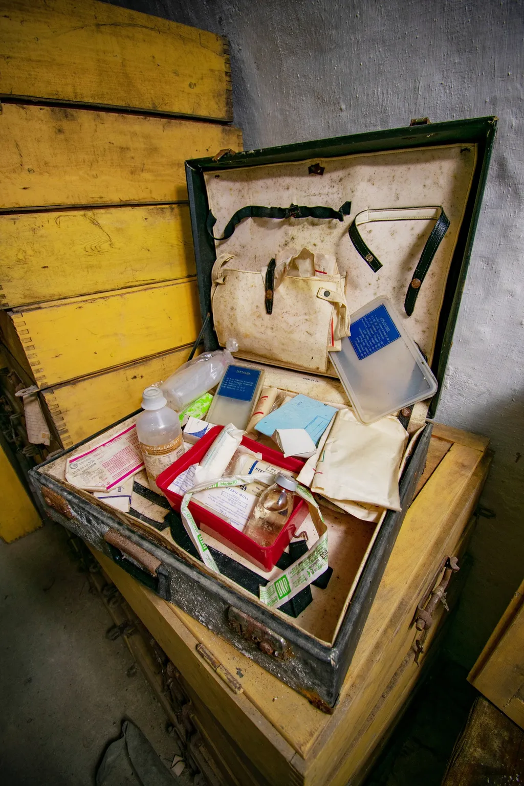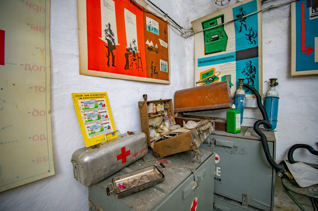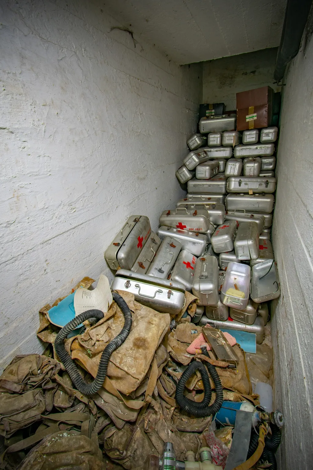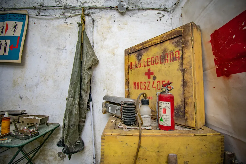Masszív vasajtó védi az óvóhely bejáratát, ami rengeteg hordágyat, készenléti ampullás dobozokat, orvosi táskákat, sztetoszkópokat és még rengeteg életmentéshez szükséges kelléket rejt.