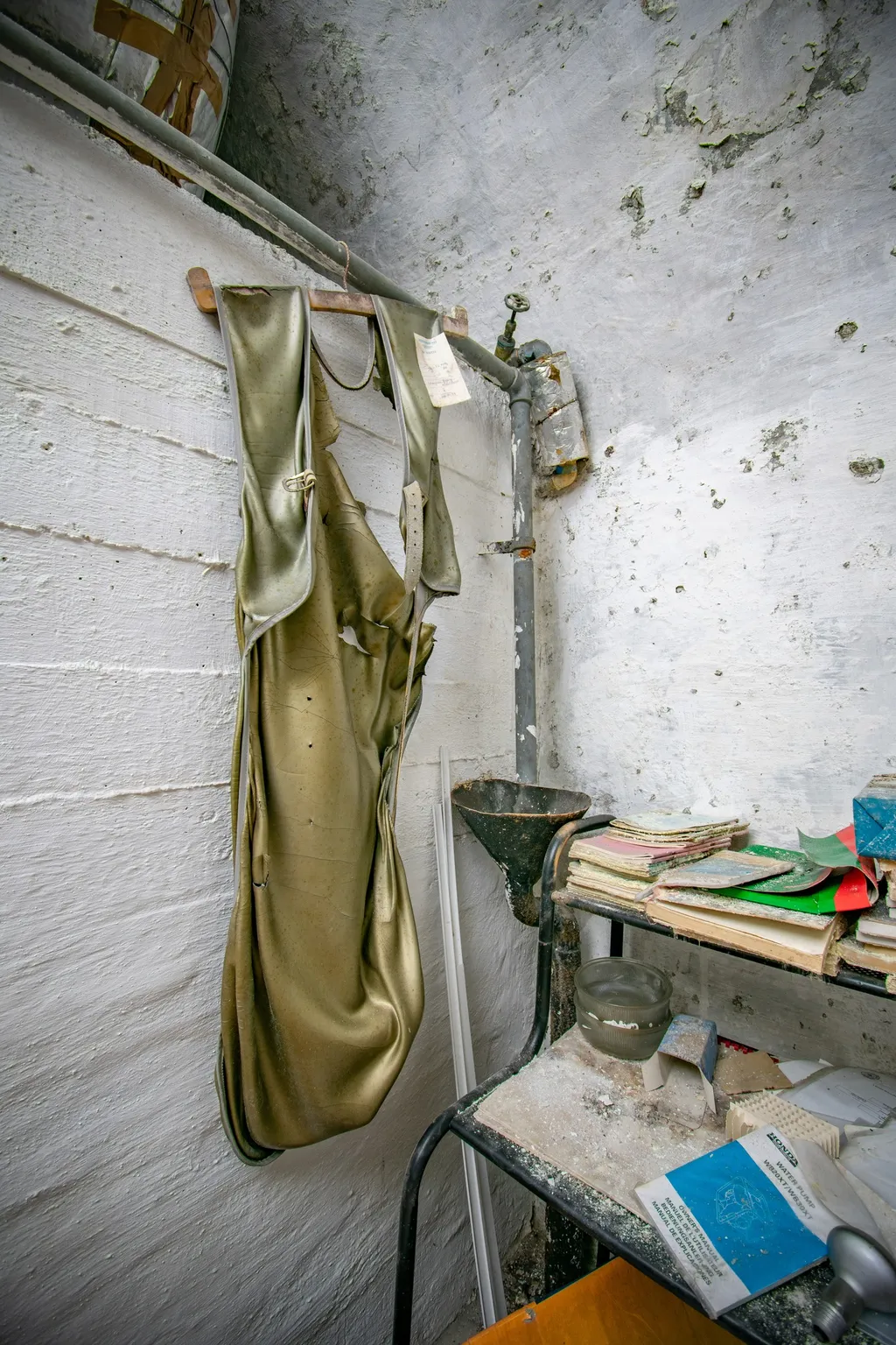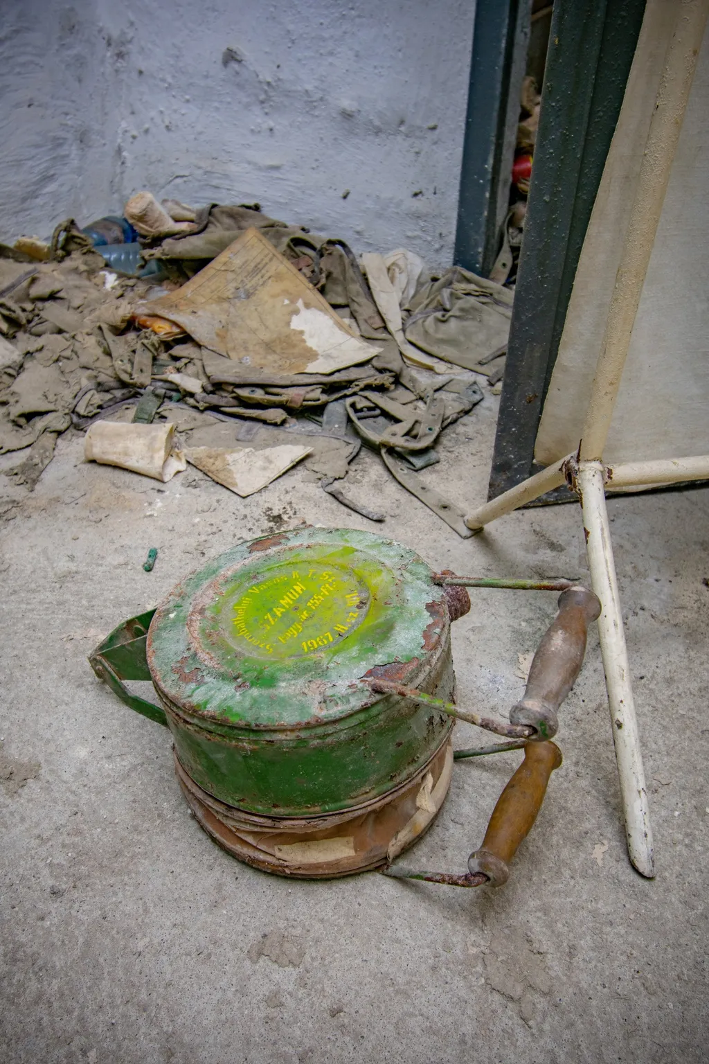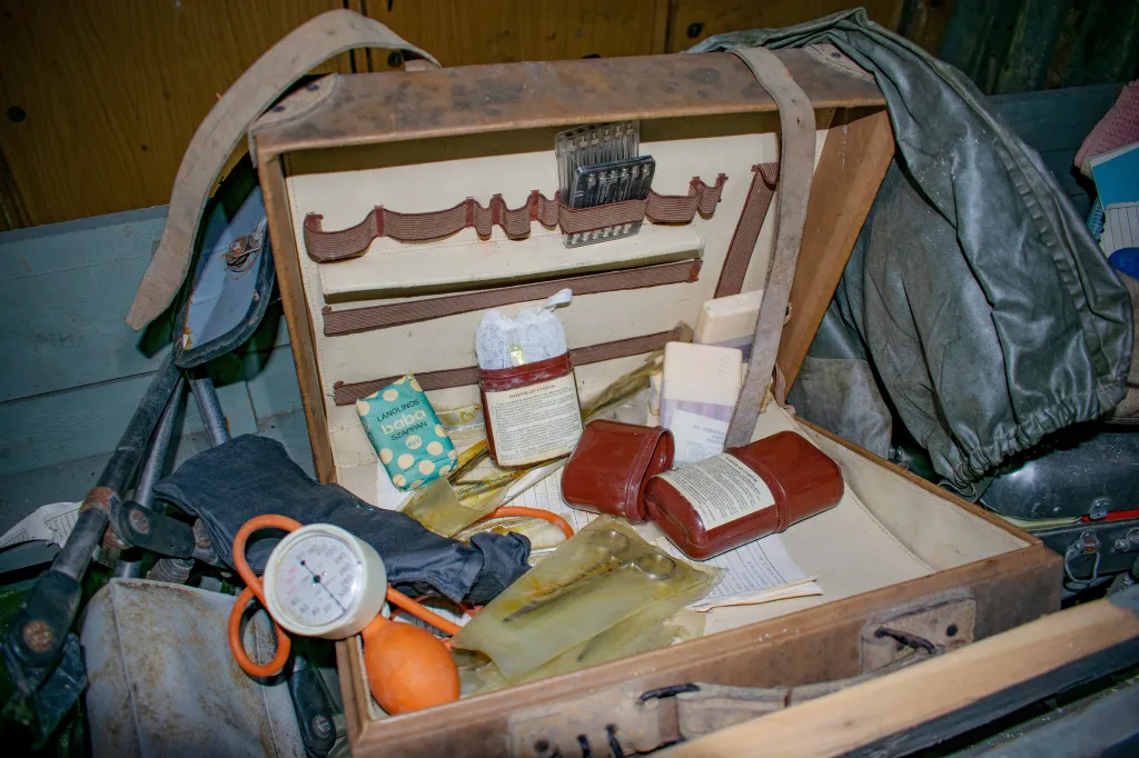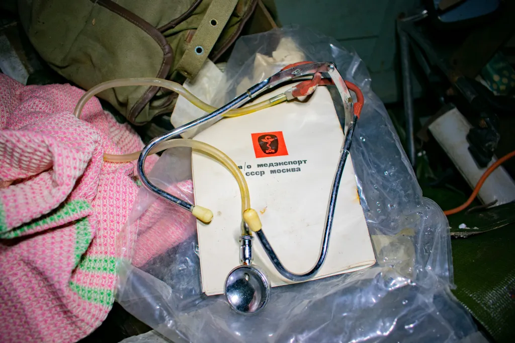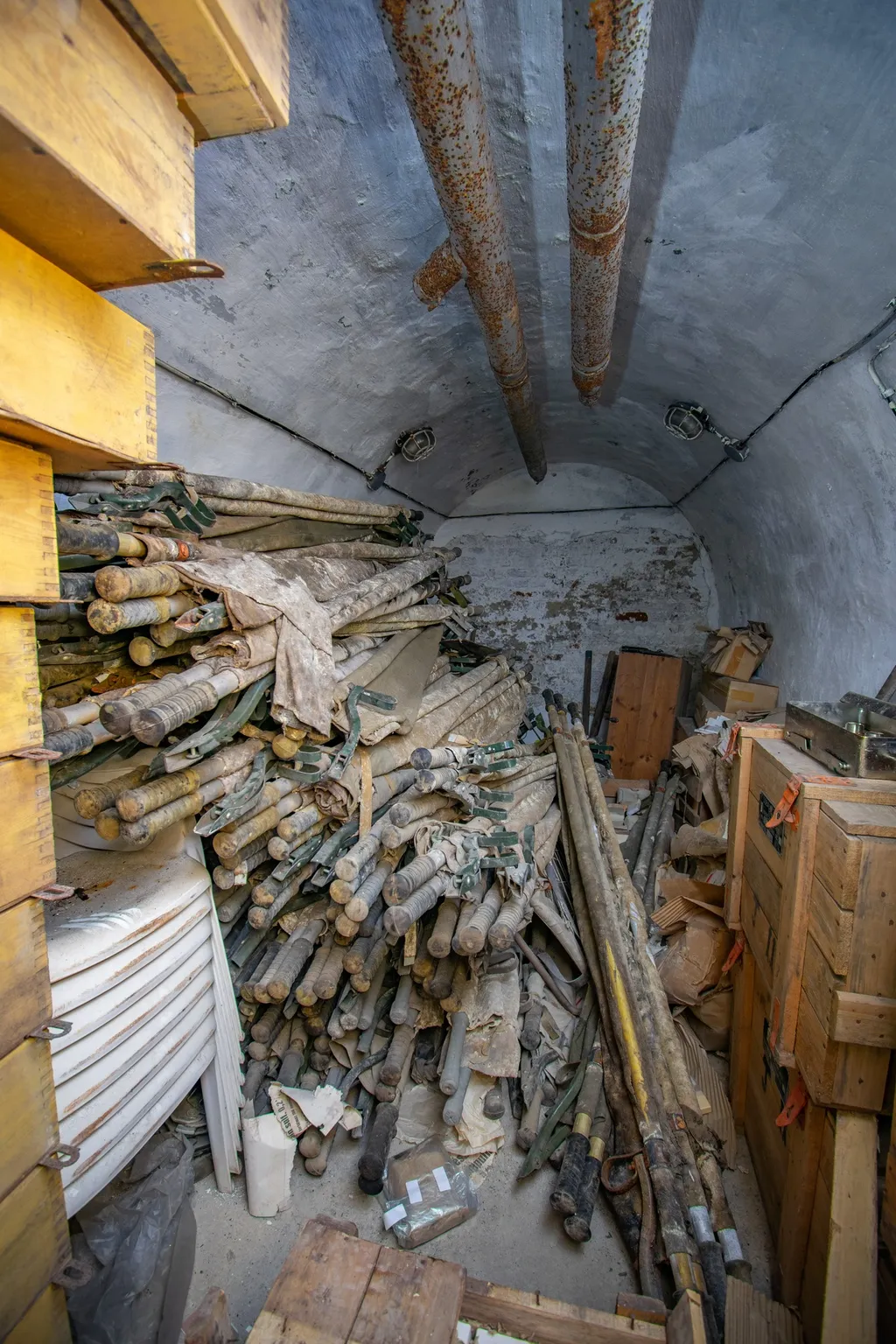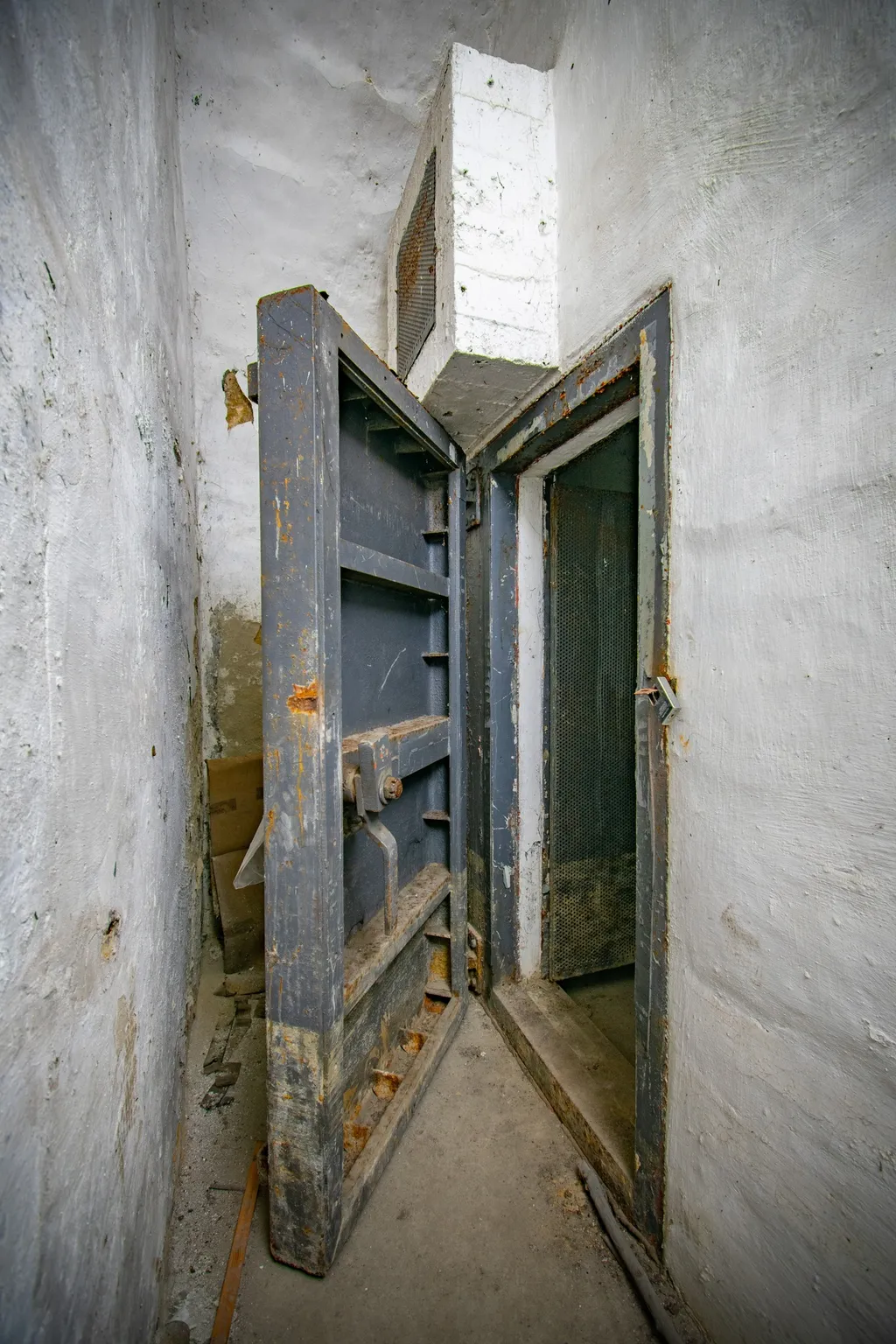 Masszív vasajtó védi az óvóhely bejáratát, ami rengeteg hordágyat, készenléti ampullás dobozokat, orvosi táskákat, sztetoszkópokat és még rengeteg életmentéshez szükséges kelléket rejt.