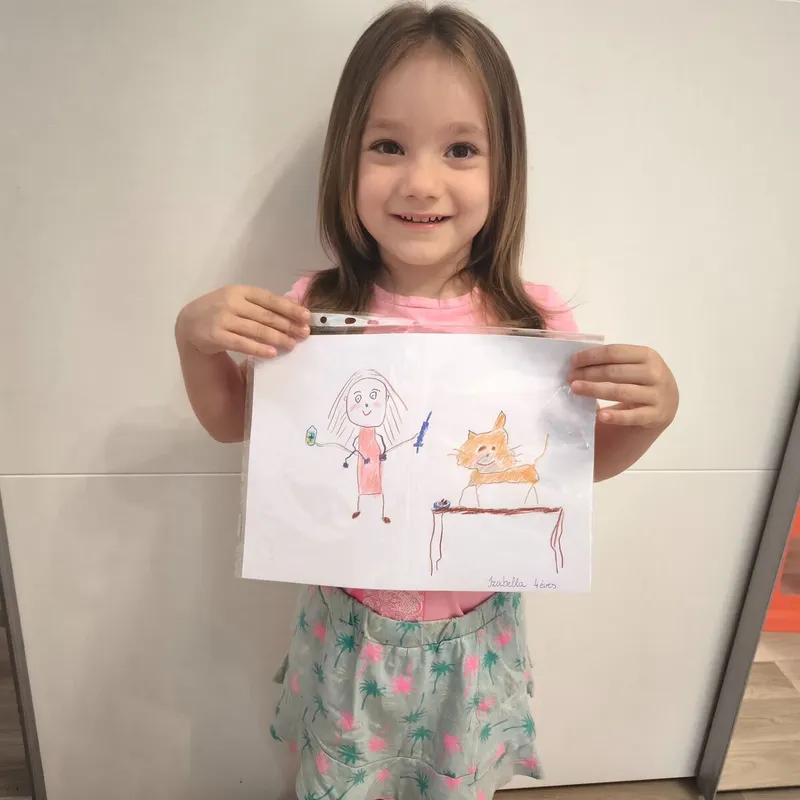 A 4 éves Izuka is nagy szeretettel készítette a rajzát. Imád mindenféle állatot, ezért ő állatorvos szeretne lenni, ha felnő. Izabelláról 14 hónapos korában derült ki, hogy leukémiás. Szülei észrevették, hogy Iza testét véraláfutások borítják, a kislány nem tudott lábra állni és a labor vérszegénységet mutatott ki. Sajnos a genetikai vizsgálat alapján kiderült, hogy jelen vagy egy magas rizikójú genetikai eltérés, ami következtében a kislánynak erős kemoterápiás kezeléseket kellett kapnia. A kemoterápia nagyon megviselte Izát, aki az aktív kezelések alatt többször kapott el fertőzéseket, súlyos állapotban még az intenzív osztályra is bekerült. Iza beszédfejlődése és mozgása a hosszas kórházban töltött idő és az ingerszegény környezet miatt lemaradt, ami miatt fejlesztőkre kell járnia. Bár a csontvelő vizsgálat negatív eredménye után a fenntartó kezeléseket már nem kell kapnia, de Iza gyakori betegségei és az állandó fejlesztések miatt édesanyja még nem tudott visszamenni a munkahelyére. Ha szeretnéd támogatni őket, az alapítvány weboldalán keresztül megteheted, de természetesen nem csak Izuka szorul támogatásra, nagyon sok kis beteg várja az adományokat.