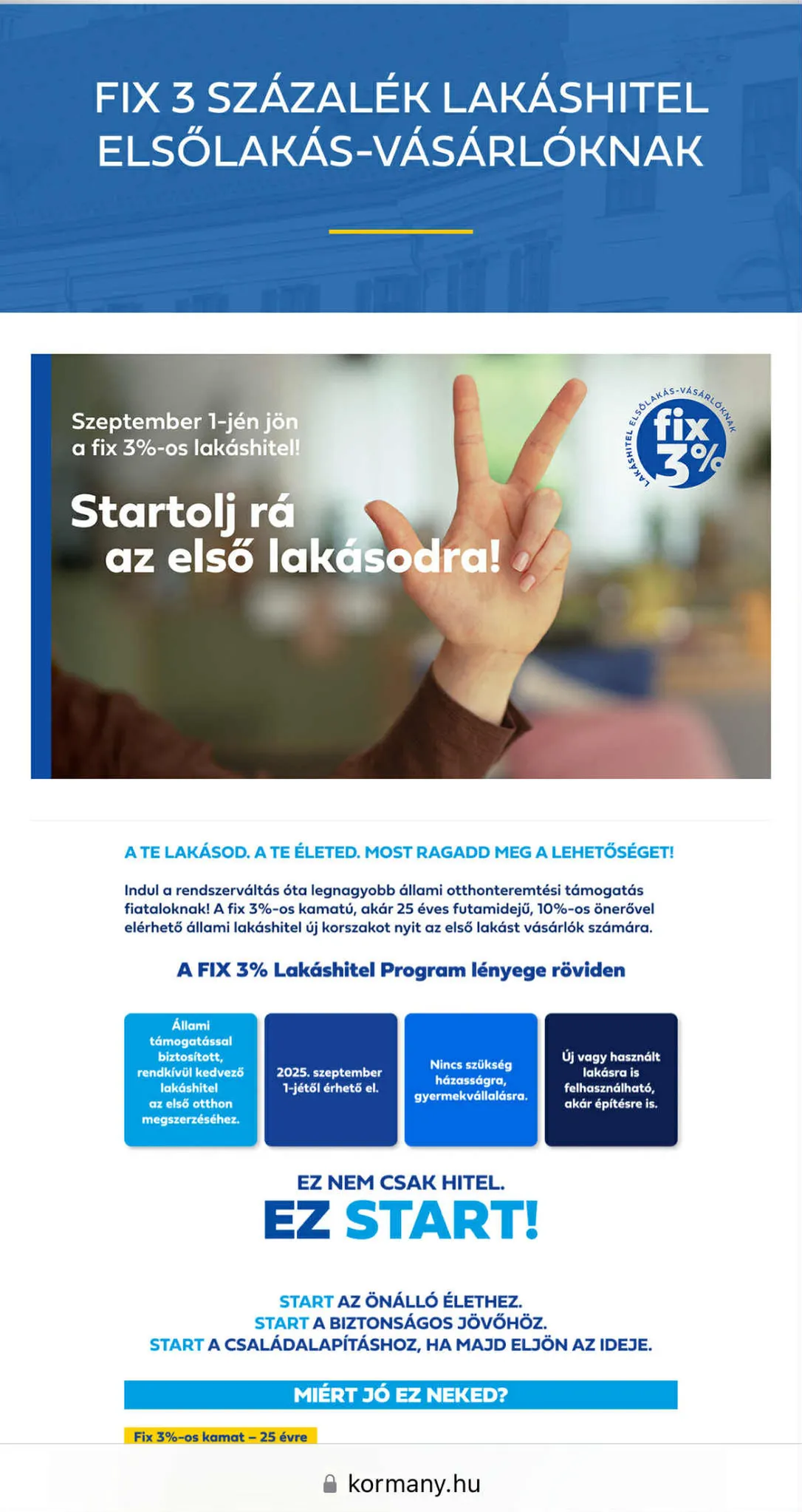 Startolj rá az első lakásodra! A kormany.hu honlapon minden fontos információ a fix 3 százalékos lakáshitelről