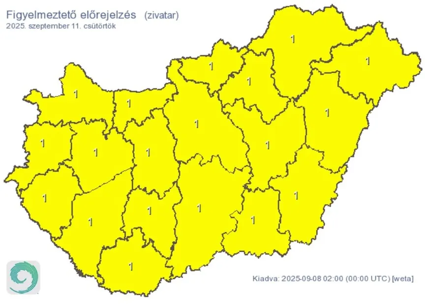 Ahogy az alábbi ábra mutatja, 2025. szeptember 11-ére, csütörtökre mind a 19 vármegyére elsőfokú riasztást adtak ki zivatar miatt:
