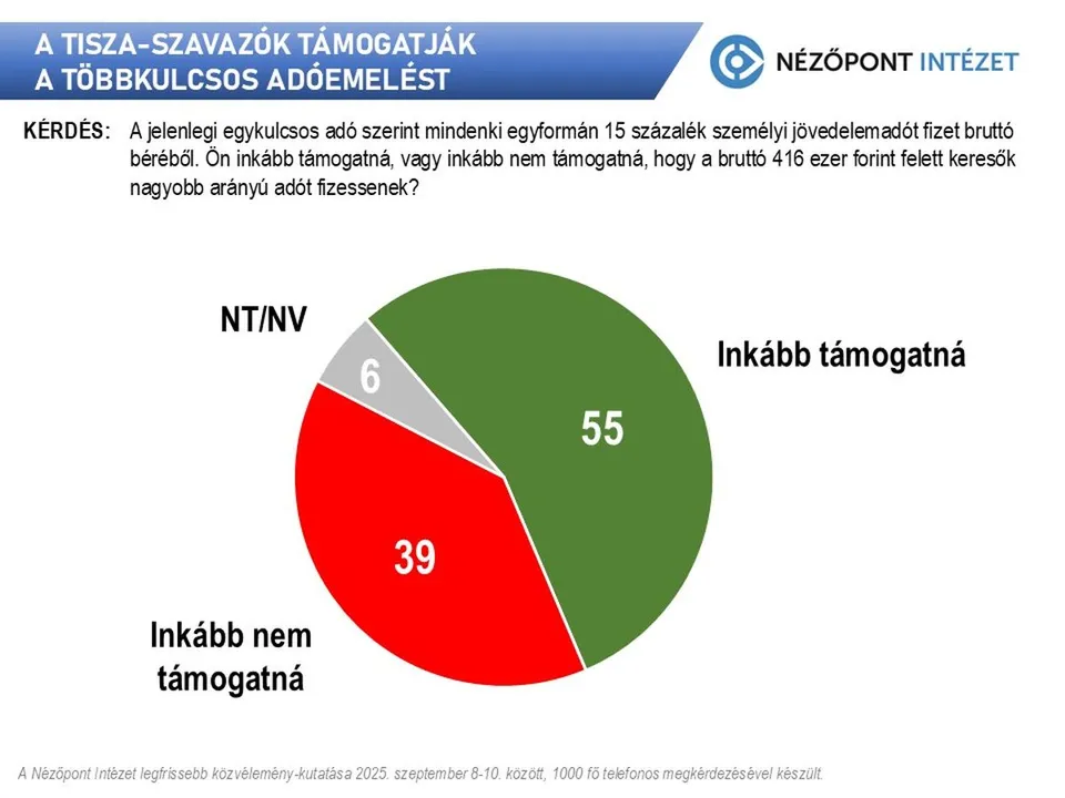 a Tisza Párt támogatóinak 55 százaléka inkább támogatná, hogy a bruttó 416 ezer forint felett keresők nagyobb arányú adót fizessenek. 39 százalékuk nem ért ezzel egyet, míg azon Tisza-szavazók aránya, akik nem tudnak vagy nem akarnak állást foglalni a kérdésben, mindössze 6 százalék.