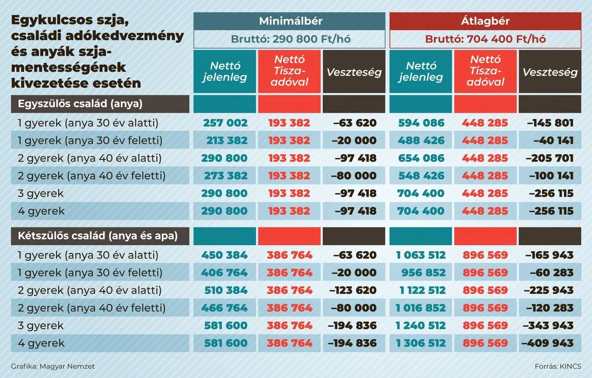 A Tisza Párt esetleges 2026-os győzelme alapjaiban írná át a magyar adózás és a családok támogatásának rendszerét. A családi adókedvezmény és az édesanyák szja-mentességének megszüntetése következtében a családok havi jövedelme jelentősen csökkenne, nemtől, életkortól és a gyermekek számától függően. A Kopp Mária Intézet a Népesedésért és a Családokért számításai szerint