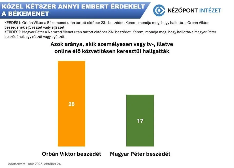 A felnőtt magyarok 28 százaléka hallgatta meg Orbán Viktor október 23-ai beszédének „egy részét vagy egészét”, személyesen vagy tv-, illetve online élő közvetítésen keresztül.