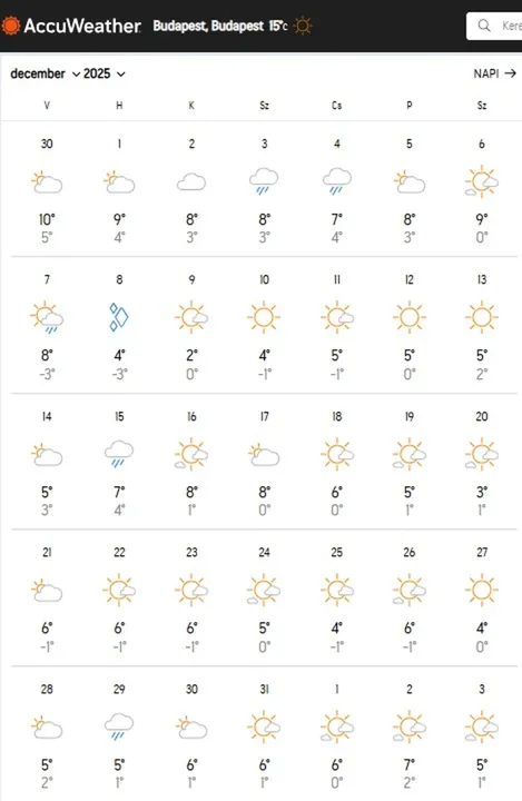 Sajnos nincs jó hírünk! Az AccuWeather október elején elérhető 2025-ös decemberi prognózisa szerint nem várható fehér karácsony Budapesten, sőt, a mellbevágó prognózis az év előttünk álló napjainak egyikére sem ígér havazást... Még december 31-ére sem. Egy dolog vigasztalhatja csak a havazás szerelmeseit: a meteorológus is ember, vagyis nem tévedhetetlen!