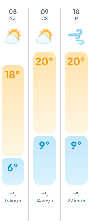 Kissé fellélegezhetünk az előző napok hűvös időjárásaiból, ugyanis a hét közepéhez érkezve napos időre számíthatunk, amit csak egy-egy gomolyfelhő zavarhat meg. Ennek fényében eső csak elvétve fordulhat elő, akkor is csak kisebb zápor. A reggelek 6-8 fok körül indulnak, míg délután 15 -20 fok közé erősödik a nappali felmelegedés.