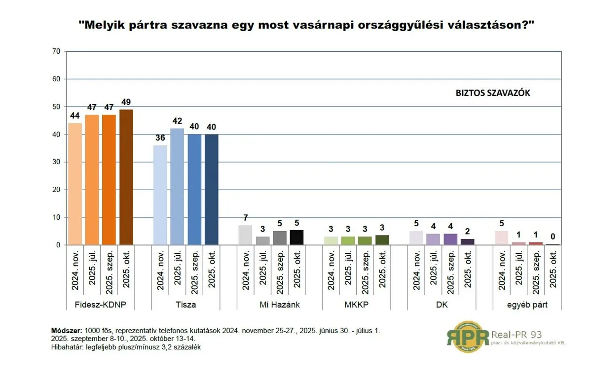 A Real-PR 93. közvélemény-kutatása alapján Magyar Péter pártjának változatlan támogatottsága (40 százalék) mellett a kormánypártok erősödtek a pártok versenyében, miközben a Mi Hazánk épp a bejutási küszöbön áll (5 százalék) október közepén. Más párt nem jutna az parlamentbe a kutatás szerint.